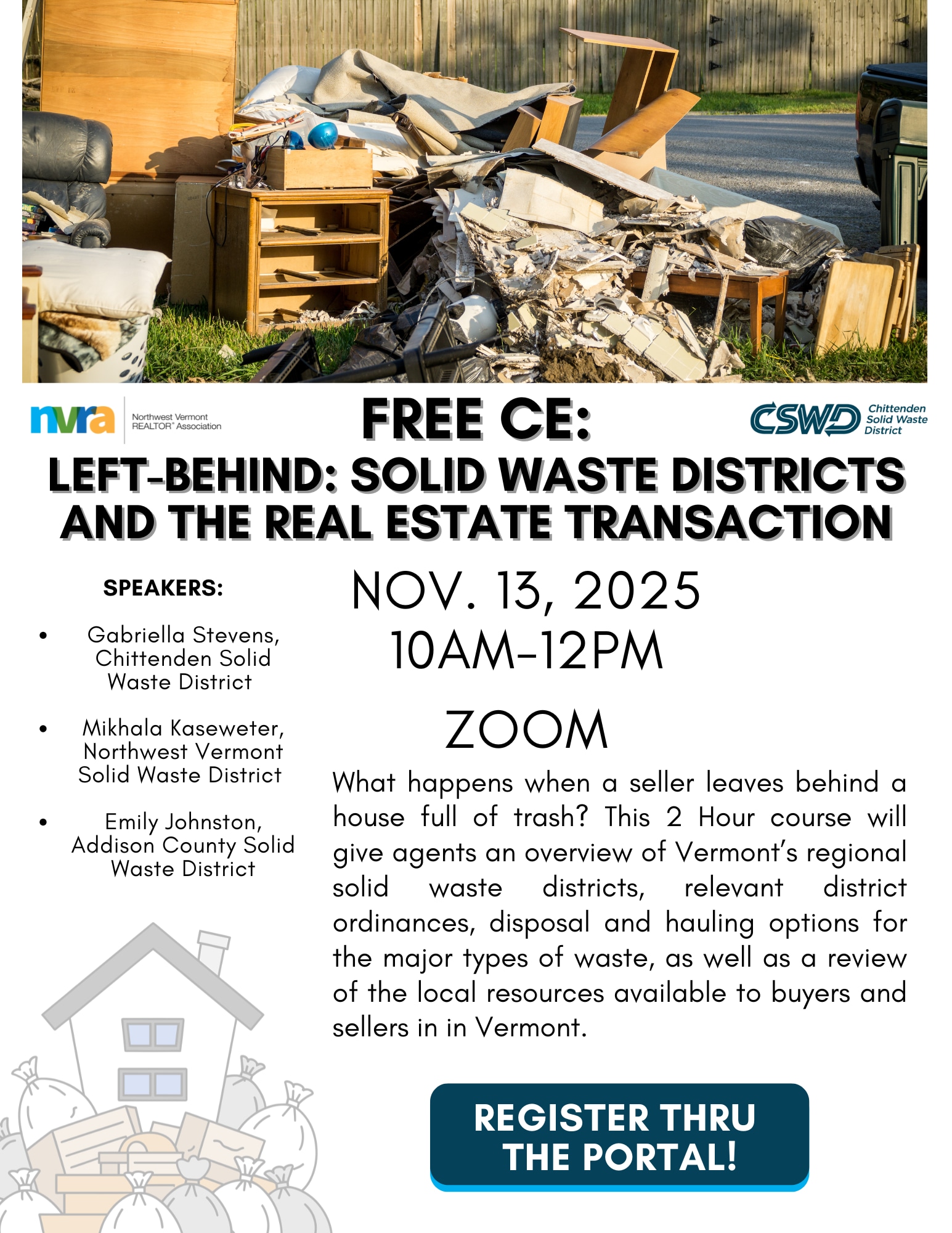 What happens when a seller leaves behind a house full of trash? This 2 Hour course will give agents an overview of Vermont’s regional solid waste districts, relevant district ordinances, disposal and hauling options for the major types of waste, as well as a review of the local resources available to buyers and sellers in in Vermont. This course will be delivered via Zoom. In order to earn CE credit for courses delivered online, participants must have their cameras on for the duration of the course. The connection link will be emailed to all registrants the morning of the course. Instructors: Gabriella Stevens, Chittenden Solid Waste District Mikhala Kaseweter, Northwest Vermont Solid Waste District Emily Johnston, Addison County Solid Waste DistrictAdditional Info